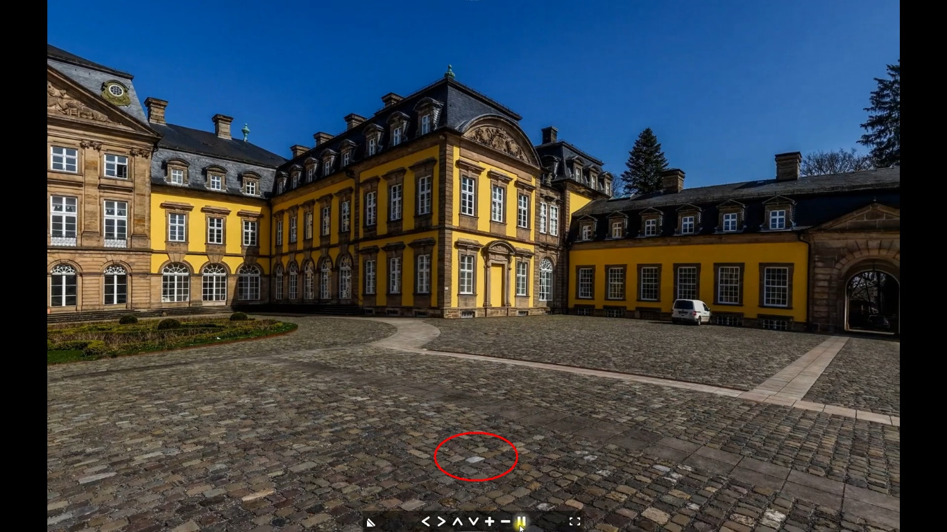 Bei dem Arolsen-Panorama kann man das sehr schön beobachten: Hier unten sieht man z.B. den Auschnitt bei 2:27 und bei 2:47. Ich habe einen hellen Pflasterstein rot markiert; er ist bei 2:27 deutlich von der unteren Bildkante entfernt und bei 2:47 genau an der unteren Bildkante zu sehen. Der Viewer verzerrt das Bild also in der Höhe, und zwar abhängig von der seitlichen Position (also der x-Achse). Für ein Stereobild bedeutet dies, dass der Viewer einen lokalen Höhenfehler erzeugt. Damit scheidet diese Methode der Betrachtung für (ernsthafte) stereoskopische Zwecke aber aus!
