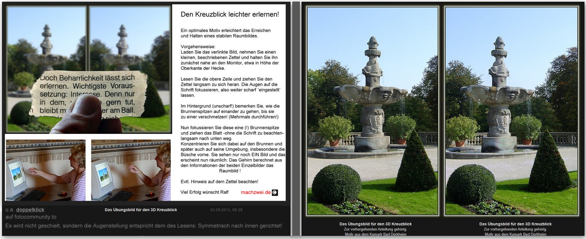 Danke für Anleitung, leider ist es aber nicht so, dass man mit dem Kreuzblick eine universelle Erreichbarkeit bekommt. Stefan Layer, unser früherer wissenschaftlicher Beirat, hatte im stereo journal Heft 104 ein Umfrageergebnis unter den ISU Mitgliedern (also erfahrene Stereoskopiker) veröffentlicht, das ich hier kurz zitieren möchte: Etwa 12% sind reine Kreuzblicker, 20% reine Parallelblicker, 23% können beides gleich gut, 21% können beides, bevorzugen aber den Kreuzblick, weitere 14% können ebenfalls beides, bevorzugen aber den Parallelblick, und der Rest kann weder das eine noch das andere.