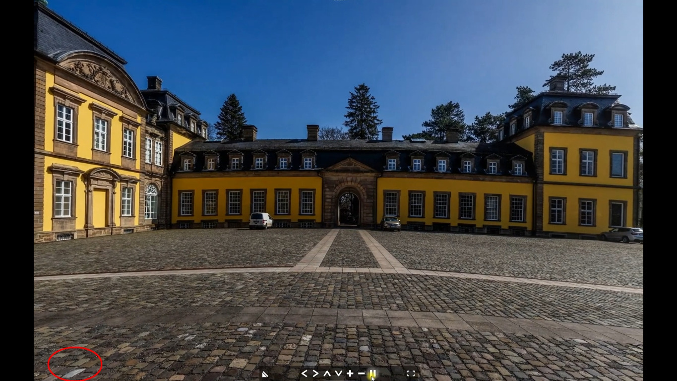 Bei dem Arolsen-Panorama kann man das sehr schön beobachten: Hier unten sieht man z.B. den Auschnitt bei 2:27 und bei 2:47. Ich habe einen hellen Pflasterstein rot markiert; er ist bei 2:27 deutlich von der unteren Bildkante entfernt und bei 2:47 genau an der unteren Bildkante zu sehen. Der Viewer verzerrt das Bild also in der Höhe, und zwar abhängig von der seitlichen Position (also der x-Achse). Für ein Stereobild bedeutet dies, dass der Viewer einen lokalen Höhenfehler erzeugt. Damit scheidet diese Methode der Betrachtung für (ernsthafte) stereoskopische Zwecke aber aus!