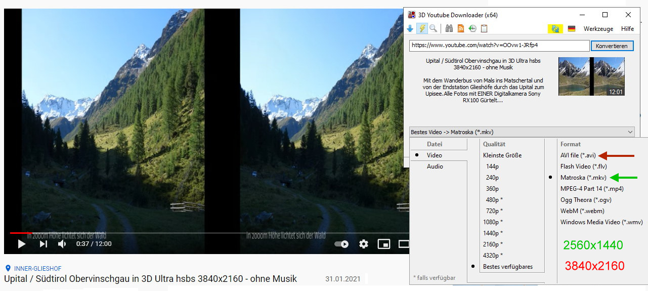 Für Youtube ist also die hsbs in 3840x2160 anerkannt. Zumal man diese Version direkt mit normaler Brille, wie von mir beschrieben, auf dem Smartphone betrachten kann. Ich lade die Videos als wmv hoch - geringste Dateigröße.