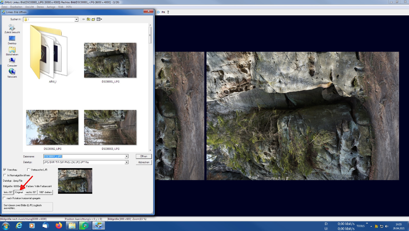 Geöffnet wird im Menü mit "linkes/rechtes Bild" öffnen. (siehe 1 Bild) Zuerst sollte das linke Bild geöffnet werden. Wenn dann im Menü, "Original" angeklickt ist, liegt es bei mir auch auf der linken Seite, wie Du im nächsten (2) Bild siehst. Das Rechte ebenso.