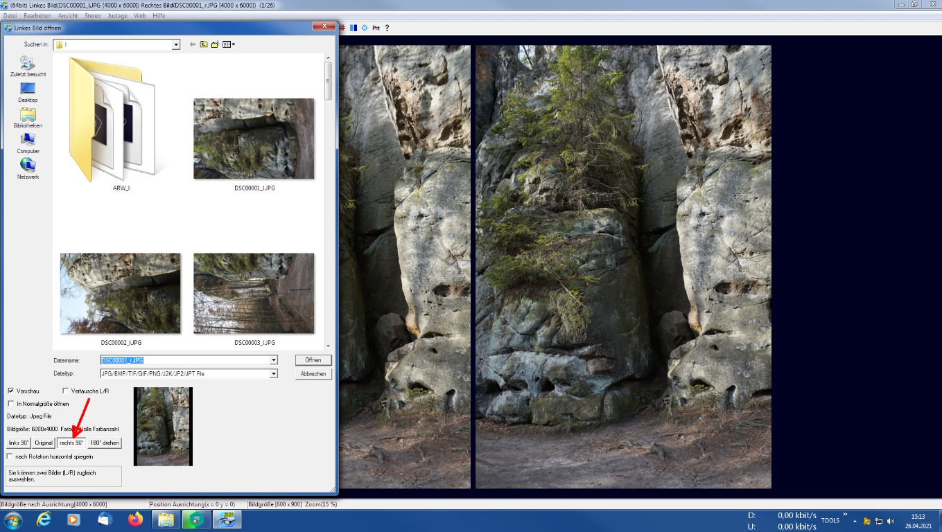 Wenn das linke Bild mit "Rechts 90° " geöffnet ist schlägt das Programm vor das Rechte automatisch zu suchen. Oft passiert es das das Rechte dann wieder mit "Original" geöffnet wird. Ergebniss ... Linkes steht und Rechtes liegt. Also besser den Pfad zum linken und rechten Bild per Hand eingeben und darauf achten, das die Einstellung bei "Rechts 90° " bleibt. Hat man wenig Bilder ist das ein wenig Fleißarbeit. Hat man viel Bilder ist man mit Cosima im Vorteil. Es gibt fast nix was man dort nicht vorher einstellen kann ...