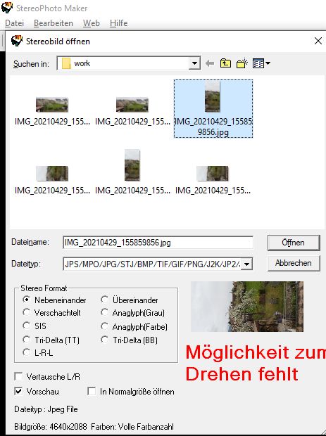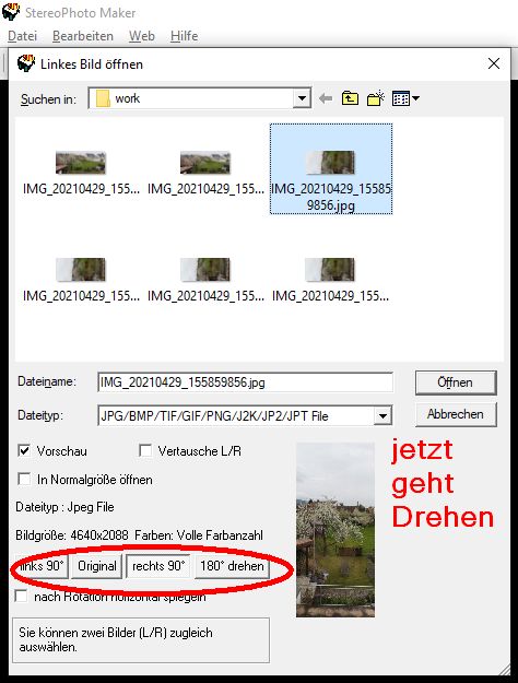 Wenn ich nun diese Bilder mit Irfanview öffne und ohne jede Änderung wieder abspeichere, dann wird mir in StereoPhotoMaker die Option zum Drehen angeboten: